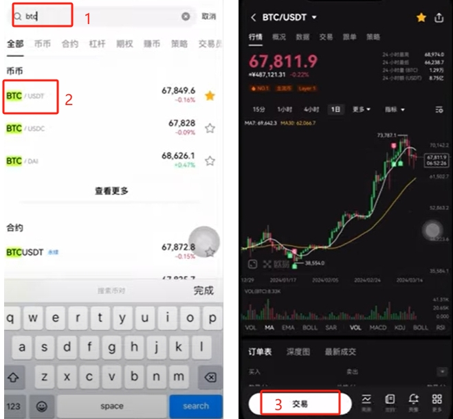 我们想买比特币就可以回到首页,上方直接搜索“BTC”,这里显示的第一个“BTC/USDT”就是比特币的现货交易对和USDT的交易对。直接点击选择它。点击左下角的【交易】