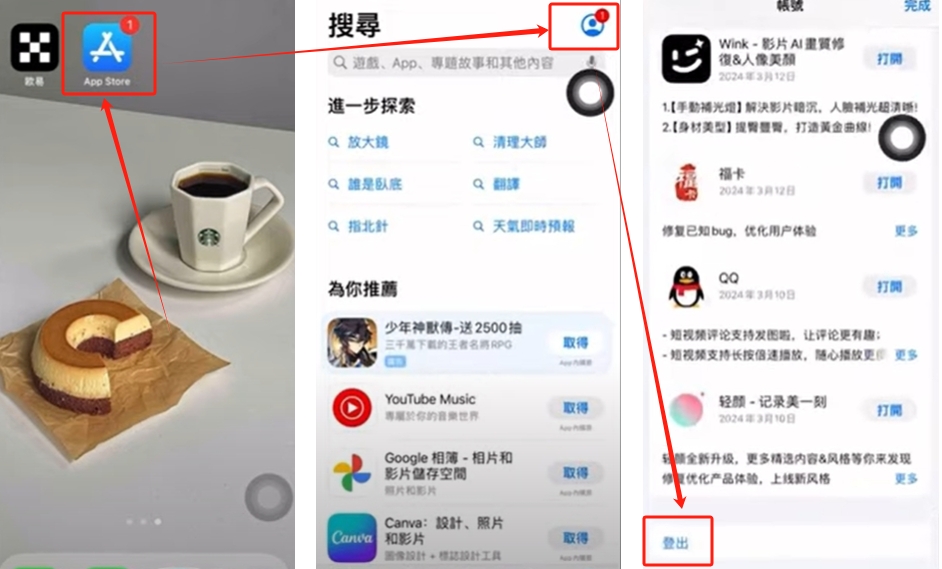然后打开Appstore,点击右上角的小人头像,往下滑找到【登出】在这里换登ID。