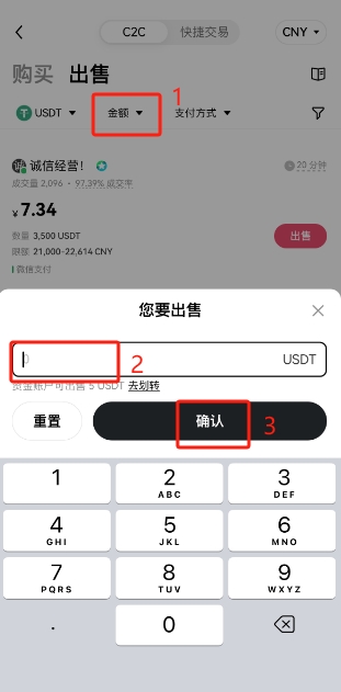 3、点击【金额】,输入想要出售USDT数量,点击【确认】
