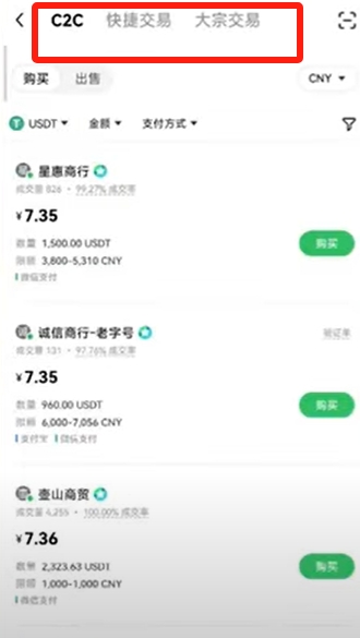 首先我们要先观察手机屏幕的顶部。有C2C、快捷交易和大宗交易这三个选项。我们先来讲一讲这三个东西的差别。