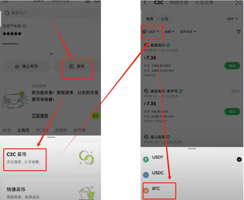 点击【买币】,选择C2C买币,点击“USDT”,在下方选择“BTC”。